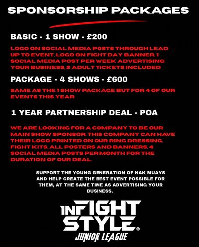 Partnering with Infightstyle Junior League gives your brand direct exposure to a fast-growing UK Muay Thai audience. Through event branding and strong social media reach, your business will be seen by fighters, coaches, and supporters nationwide.